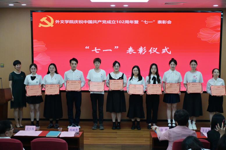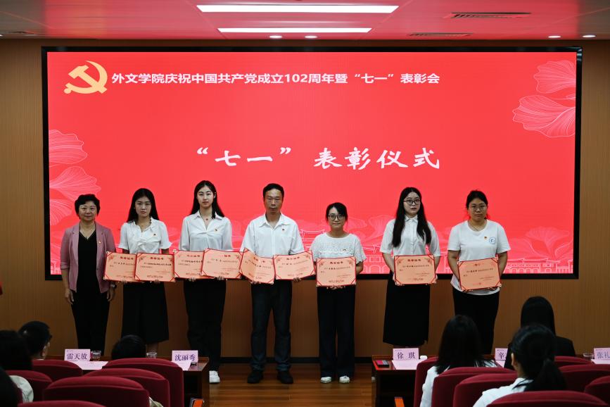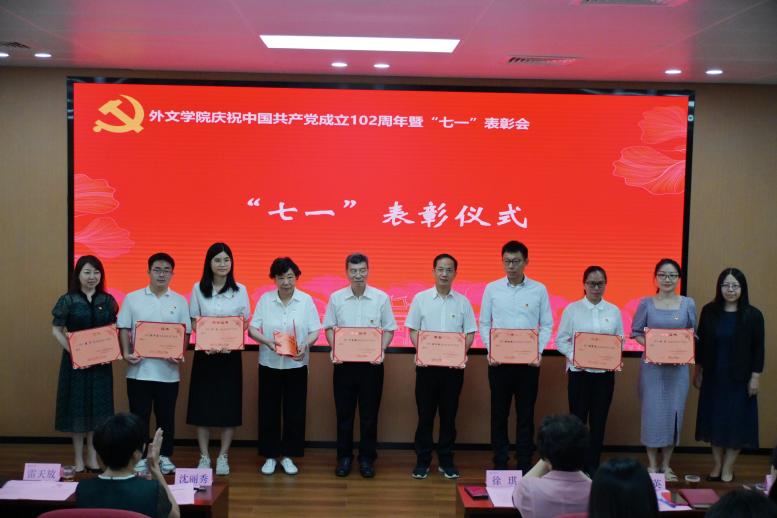 为庆祝中国共产党102周年华诞,深入学习贯彻党的二十大精神,推动形成崇尚先进、见贤思齐的浓厚氛围,6月30日上午,外文学院党委召开“七一”表彰大会,对一批先进集体和优秀个人进行表彰,并举行“光荣在党50年”纪念章颁发仪式和新发展党员入党宣誓仪式。校基层党建工作联络员黄定基,外文学院党委书记徐琪,党委副书记张胜强、沈丽秀,党委委员、副院长辛志英等出席会议。会议由张胜强主持。
