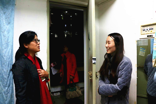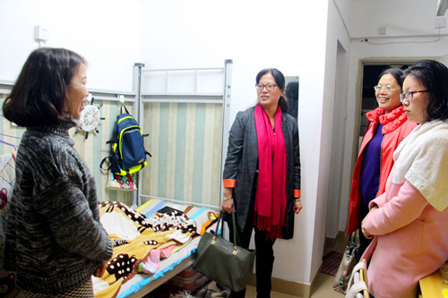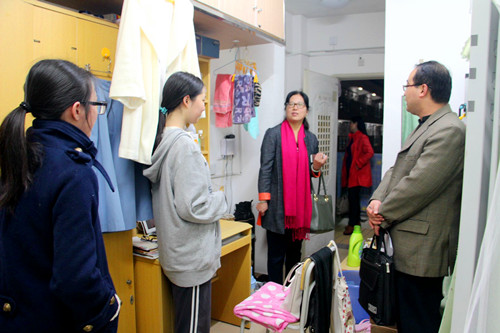随后,领导老师来到海韵研究生公寓。党委书记陈志伟老师对研究生公寓内良好的学习气氛和整洁的宿舍布局提出了表扬,她亲切询问学生的学业现状和未来规划,并鼓励研究生要多与导师沟通。老师们还特意关怀了由于意外受伤休学、近期刚刚返校的14级研究生邱倩怡同学,对她的康复表示祝贺,赞赏其坚强和勇气,并向同学们表示,有困难一定要及时向老师反映,学院会尽最大的努力去解决和完善。对于研二将要出国的学生,老师们给予了充分的肯定和对其在学习与生活上的殷殷嘱托。老师们和蔼可亲的笑容和对同学们亲切关怀的慰问使得交流的氛围十分轻松温馨,在这样氛围的感染下,同学们也都大方得体地与老师们热切地攀谈起来。