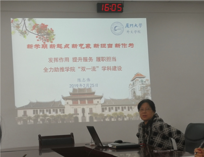 与此同时,英语语言文学系全体教职工也于南光三515室围绕同一主题展开了学习,院长陈菁教授就厦门大学建设“双一流”大学所面临的机遇和挑战进行阐述,也对英语语言文学专业的现状和发展进行了分析和展望。新学期、新气象,与会教师深刻认识到了履职尽责、担当作为对于工作的重要意义,并决心落实到实际工作中,更好地发挥自身作用、为学院“双一流”建设贡献自己的力量。