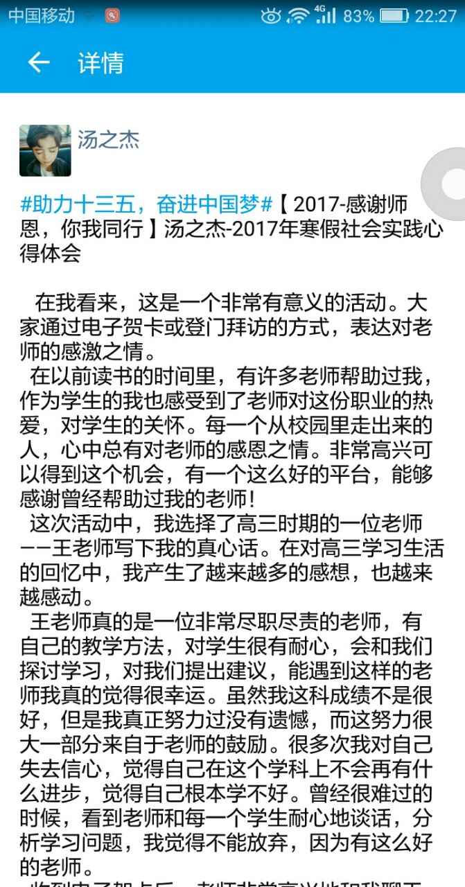 通过此次活动,实践队员们深深地感受到了感恩的重要性。一生中,需要感恩的人太多太多:度过难关时来自他人的帮助;获得温暖时来自他人的关怀;需要力量时来自他人的鼓励;开化蒙昧时来自他人的教育……凡事都需要感恩,每个人都应学会感恩!所以在完成社会实践活动之余,实践队员还通过微博、易班等途径对活动进行了宣传,让感恩的火把传递下去。