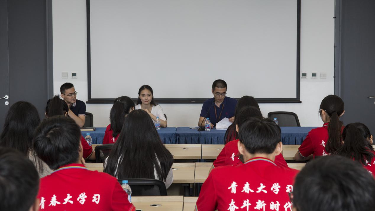 李国栋先生(左)、张晓薇女士(中)以及杨洋先生(右)与实践队员们进行座谈