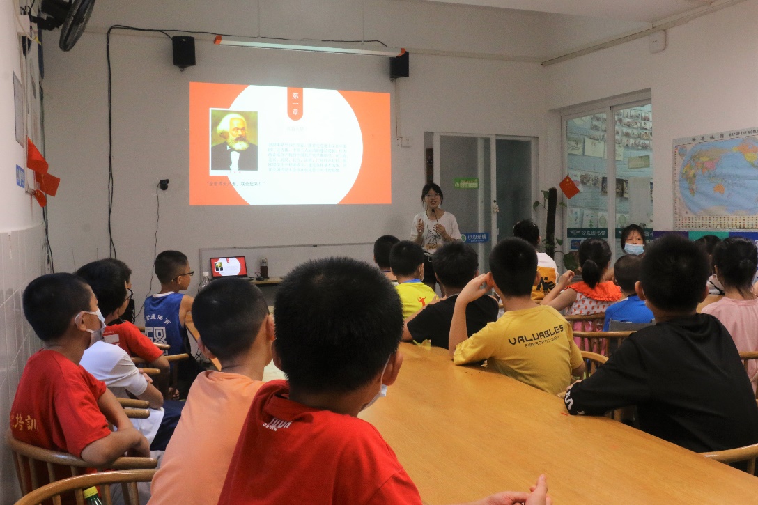 202176日,实践队第一天到达了后埔公益图书馆,宣告了夏令营教学活动的正式开始。第一天的教学内容为中国共产党的诞生,主要分为四个部分,从红色星火、会议风波到泛舟南湖、开天辟地。四五年级正是对任何事情都存在着好奇,思维最为发散灵活的时期。孩子们为马克思12岁就有这样深刻的思考而震惊,为中共一大严肃的氛围而紧张,为革命先辈们坚定的话语而触动。在队员的带领下,他们也开始思考未来的自己会是什么样子,积极踊跃地向队员们讲述他们的理想,讲述他们今后想要为我们的国家与社会做什么。他们沉浸于中国共产党的诞生历程时,清澈的眼眸里彷佛也燃起了点点的红色星火。
