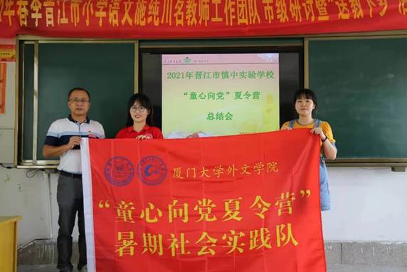 为庆祝中国共产党成立一百周年,加强党史学习教育,强化学科兴趣培养,助力乡村教育振兴,厦门大学外文学院“童心向党夏令营”暑期社会实践队积极对接泉州市晋江市慎中实验学校小学部,开展以“童心向党”为主题的暑期线上夏令营活动。本次活动形式丰富,包括党史教育课程、兴趣学科拓展课程、学习交流会、读书会等。实践队员们在教授知识的同时,关注孩子们内心的健康成长,引导孩子们敢于有梦、勇于追梦、勤于圆梦。