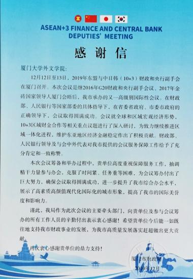 近日,厦门市财政局向厦门大学、厦门大学外文学院分别寄来了感谢信,向参与助力2019年东盟与中日韩(10+3)财政和央行副手会召开的志愿者们寄来了荣誉证书,感谢在会议的筹备和举办过程中,华体网志愿者们克服了时间紧、任务重等困难,辛勤工作,协助厦门市财政局保证会议取得了圆满成功。