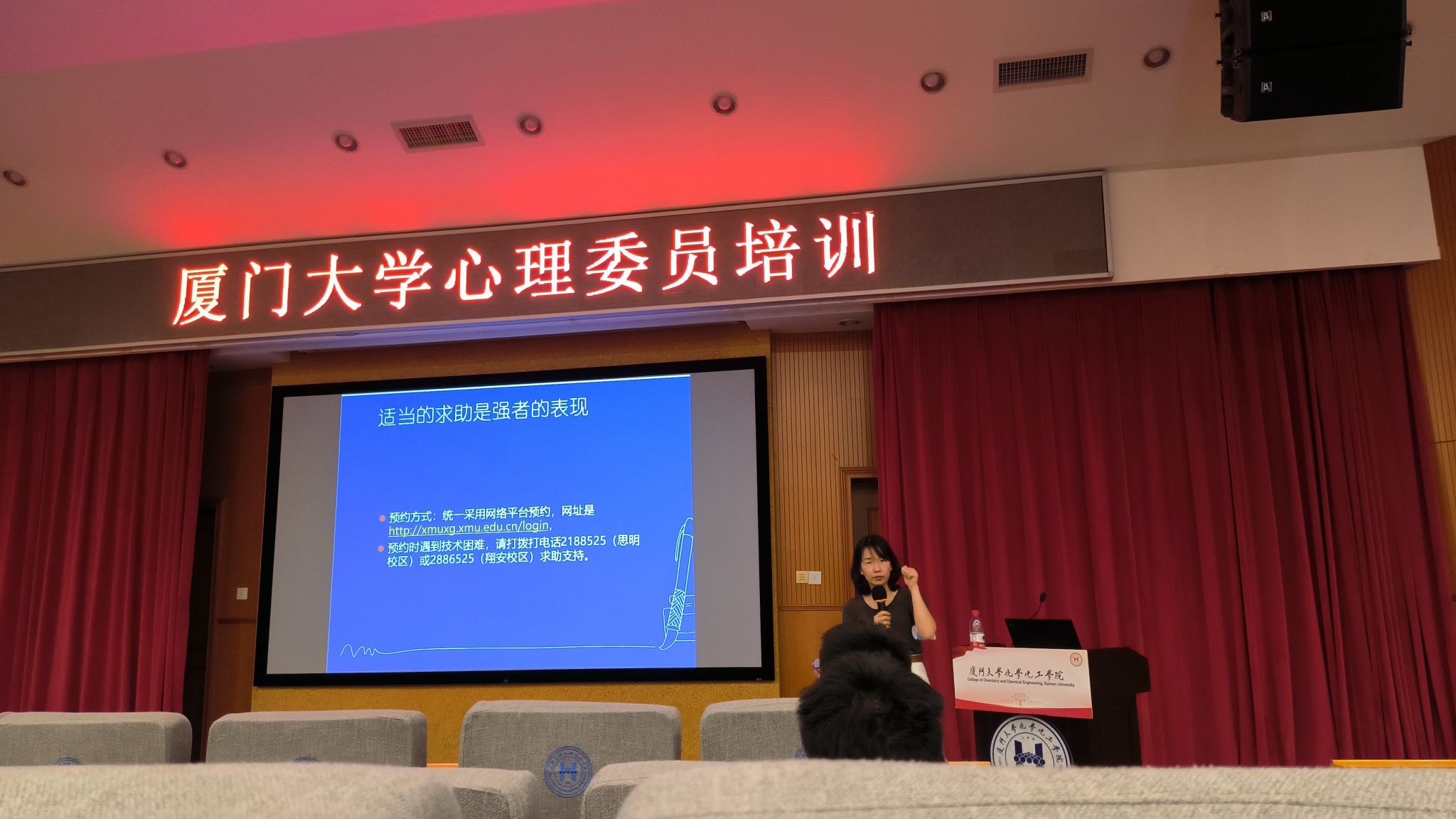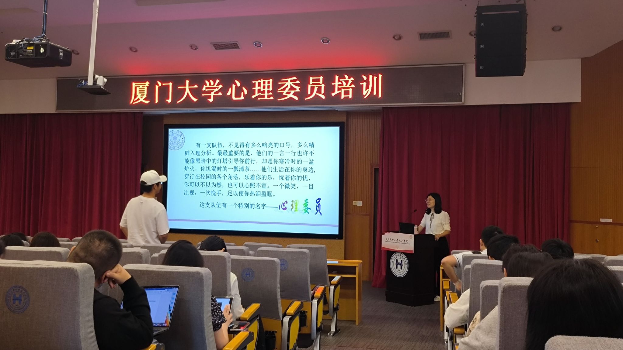 为提高心理委员群体工作能力,做好学生心理健康工作,厦门大学校心理咨询与教育中心组织开展了2022级心理学生干部培训活动。本次培训采取线上线下相结合的方式。线下心理委员的培训活动于2022年10月30日在化学报告厅开展,2022级全体宿舍心理联络员的培训采取易班线上观看视频的方式进行。