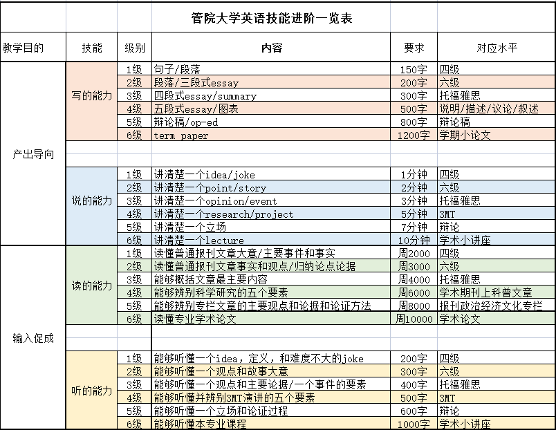 依托课程组部分成员主建的英语写作和演讲系列慕课,课程群依托部分课程组主要成员先期主建的英语写作和演讲系列慕课,包括国家级一流课程《大学英语写作基础》、省级一流课程《学术英语写作基础》《英语演讲之道》《研究性英语期刊论文写作》《中英文科技论文写作》等,共建成6门线上线下混合式课程,以多维度、多层次培养学生的专业能力和英语综合能力,尤其是说写能力和批判性思维能力。课程群的总体培养方案勾勒如下表,呈现出循序渐进、目标明确、实操性和可及性强等特点。