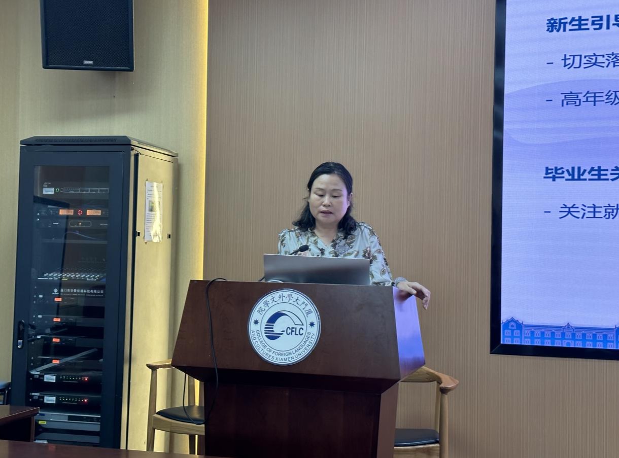 副院长辛志英对新学期研究生教学教务工作、题库建设等重点工作进行工作布置;副院长江桂英强调了新学期本科教学教务工作、授课纪律和突发情况处理等注意事项,并重点布置了本科教育教学评估、“外语+”专业建设等重点任务。