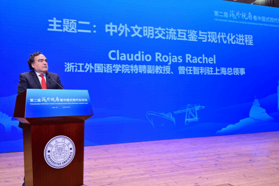 26日下午,论坛活动由厦门大学文明交流互鉴研究中心负责人、外文学院副院长刘悦教授主持。德国波茨坦大学教授、欧洲科学院院士奥特玛·埃特(Ottmar Ette)与浙江外国语学院特聘教授、智利驻上海原总领事克劳迪奥·罗哈斯·拉切尔(Claudio Rojas Rachel),围绕“文明对话与现代化进程”分别发表主旨演讲,分别从历史和当代的视角,深入探讨了欧洲、拉丁美洲与中国之间的关联。奥特玛·埃特教授回顾了中国与欧洲在贸易与文化领域的交流历程,追溯了两国人民相互探索、逐步建立信任的交流历史。拉切尔教授则聚焦于拉丁美洲与中国的关系,他指出,两国通过贸易开展合作,同时推动文化交流,实现知识共享。他还强调,未来双方需探寻平衡点,以促进共同富裕与共同发展。