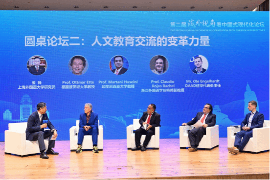 接着,上海全球治理与区域国别研究院理事长姜锋研究员主持以“人文教育交流的变革力量”为主题的圆桌论坛。奥特玛·埃特教授、印度尼西亚大学玛塔尼·侯赛尼(Martani Huseini)教授、克劳迪奥·罗哈斯·拉切尔副教授以及德国学术交流中心(DAAD)驻华代表处主任欧阳乐(Ole Engelhardt),从各自国家的独有视角出发,深入探讨了教育与文化交流在推动世界和平与发展进程中所发挥的重要作用,并积极倡导各国携手共进、相互理解与借鉴学习。