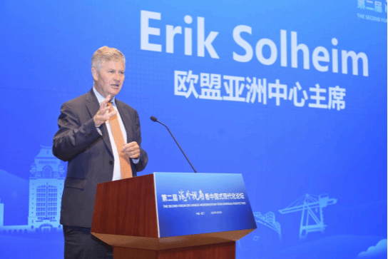 特邀嘉宾主旨发言环节,埃里克·索尔海姆聚焦中国绿色转型及全球角色,指出中国是崛起的全球南方重要一环。他建议,国际层面需构建尊重全球利益的秩序,坚持不干涉内政,设定全球共识的经贸规则,并呼吁中欧共同推动建立全球规则。