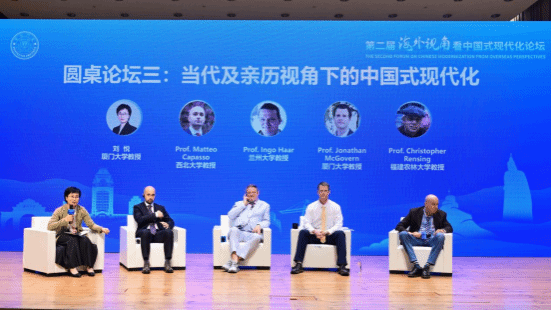 随后,“当代及亲历视角下的中国式现代化”圆桌论坛由刘悦教授主持。西北大学教授马韬(Matteo Capasso)、兰州大学教授英戈·哈尔(Ingo Haar)、厦门大学教授乔纳森·麦戈文( Jonathan McGovern)以及福建农林大学教授阮星(Christopher Rensing),纷纷在论坛上分享了他们参与中国式现代化发展的个人经历。作为中国式现代化亲历视角的体验者,他们坦诚地讲述了自己选择来中国从事教学的缘由,分享了他们与中国的独特故事,并对个人学术生涯与中国发展在未来相互促进充满信心。
