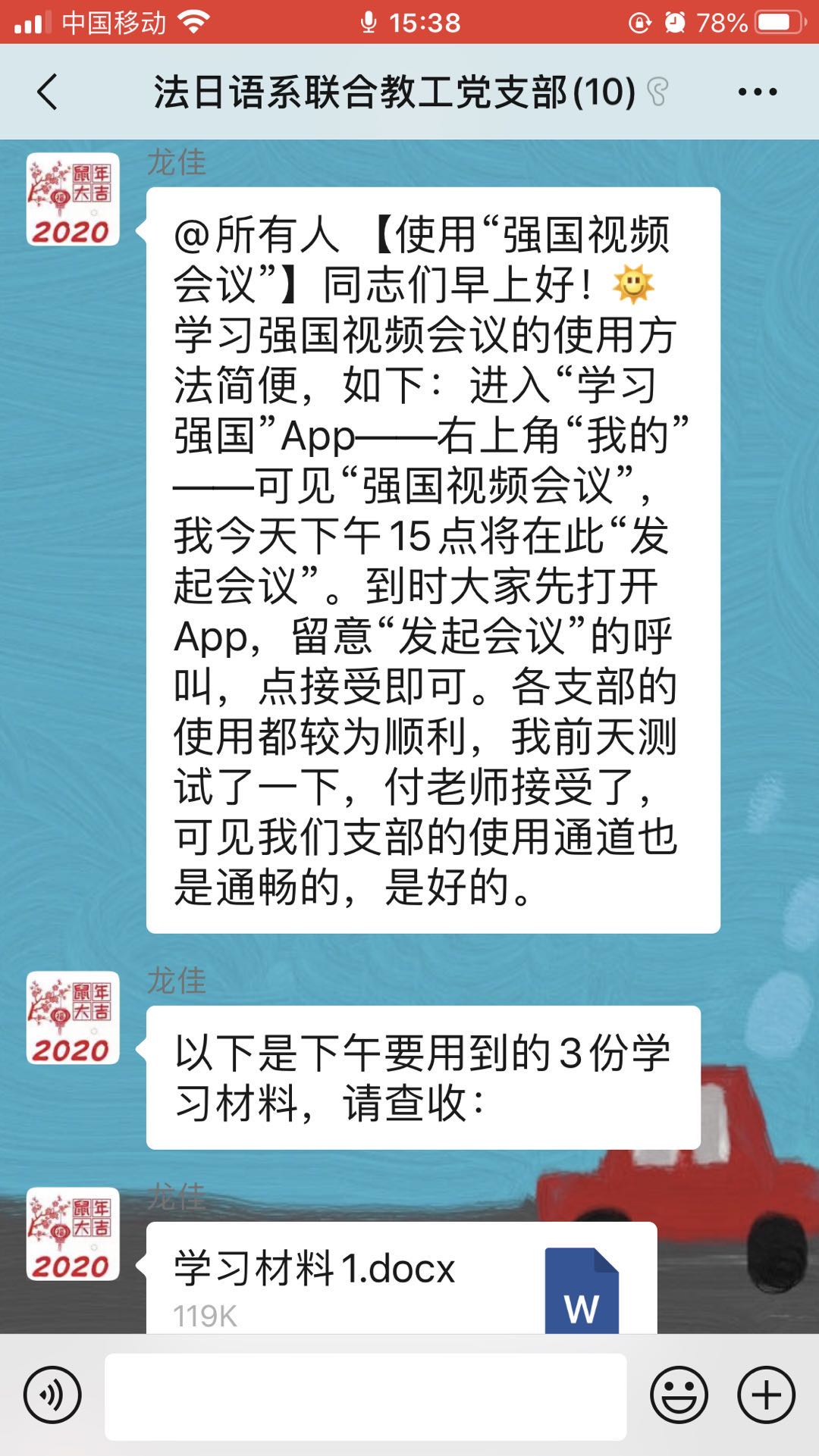 最后,支部成员就战“疫”故事、战“疫”感想、线上教学经验、学习强国心得等畅所欲言,交流了看法,体现了法语系和日语系老师们对学生尤其是湖北籍学生的关心,对所在社区、所在城市疫情防控工作的积极参与和必胜信心。