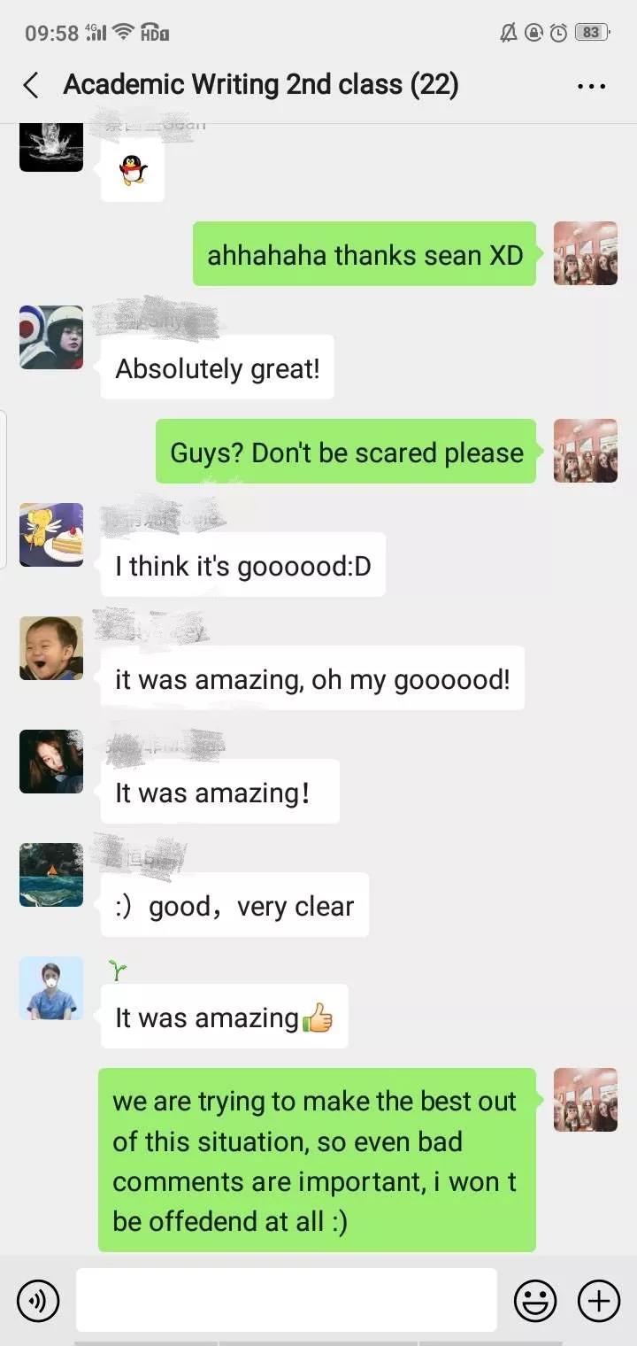 山本千瑞老师:学生们即使在线上学习也一点都不懈怠。我非常感谢群里的团队长,他们不停地帮助我核对每一门课。学院的同事给了我许多关于课堂的建议,帮助我搭建微信群。无论如何,我会尽量想办法克服因网络问题产生的困难。