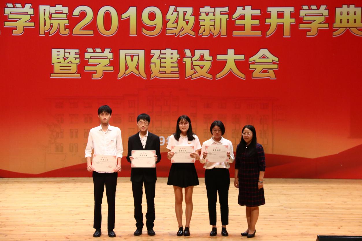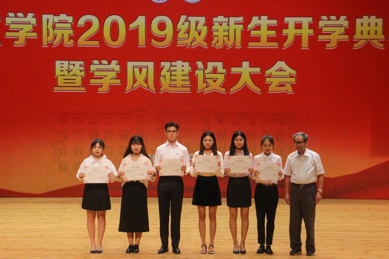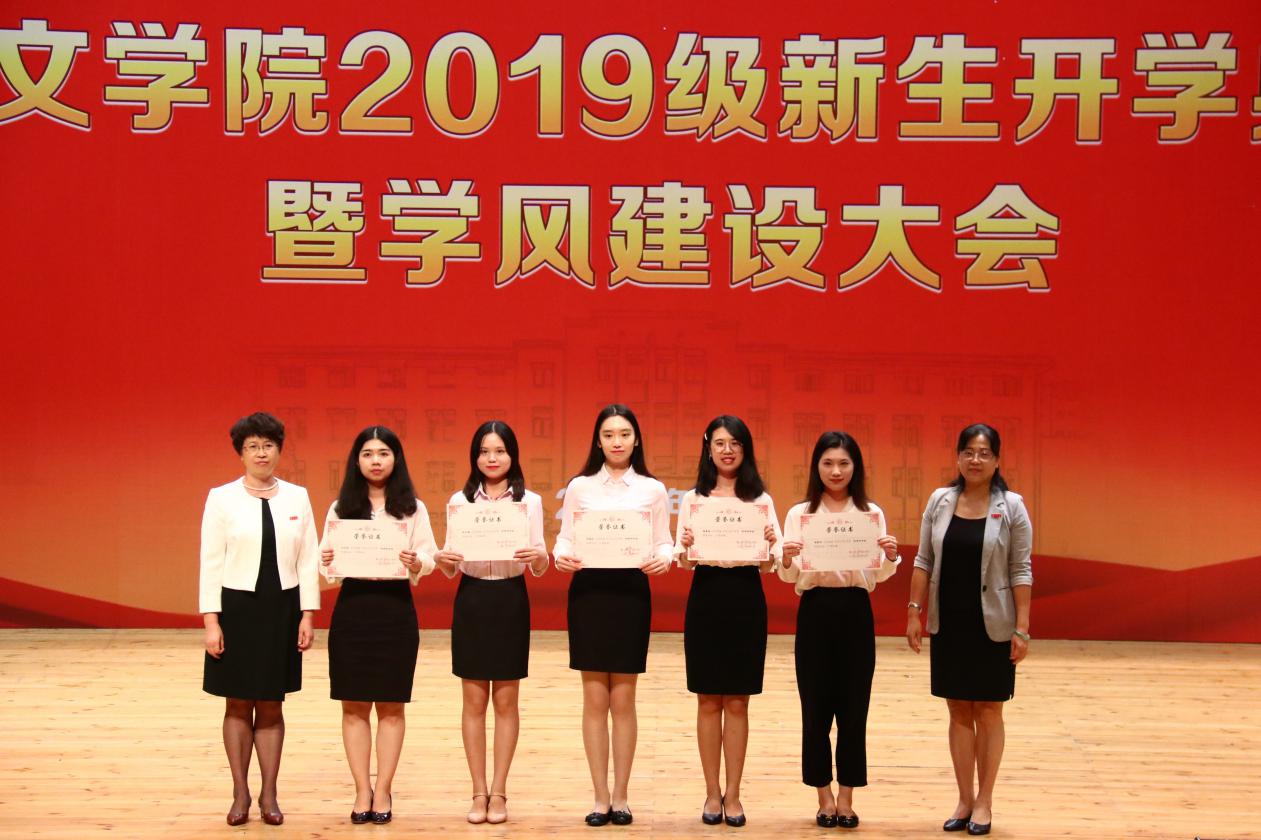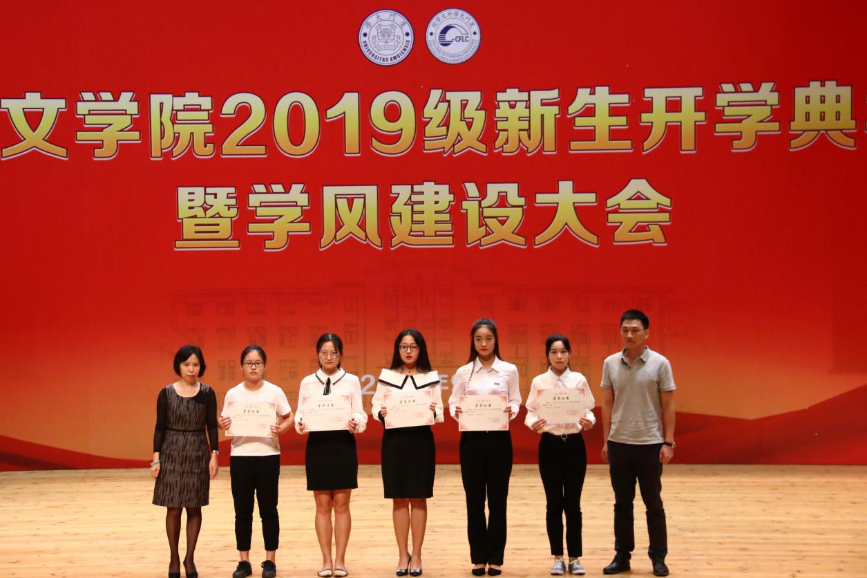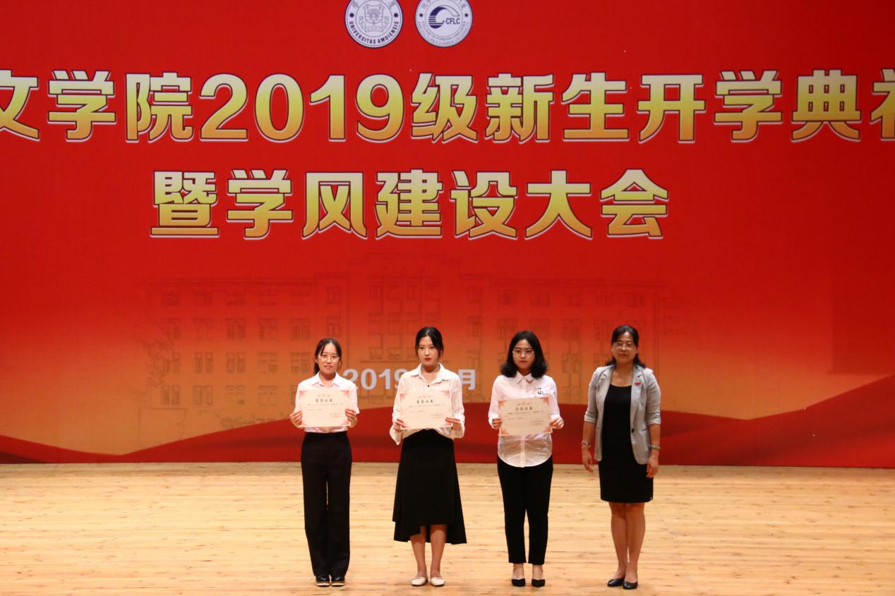 紧接着,典礼进入外文学院2018-2019学年荣誉称号、助学金与奖学金颁发环节。沈丽秀副书记宣读外文学院2018-2019学年荣誉称号表彰决定,李美华副院长宣读外文学院2018-2019学年助学金颁发决定。徐琪副院长宣读外文学院2018-2019学年奖学金颁发决定,在场领导老师及嘉宾依次为获奖者颁发证书。颁奖仪式是对过去一年里外文学子不忘初心、锐意进取的肯定,同时也激励着新生们在未来乘风破浪,勇攀高峰。