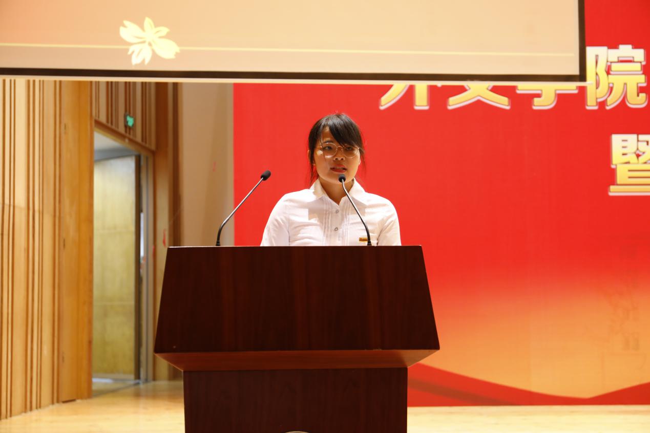老生代表、2018级外国语言学及应用语言学专业硕士生、2018级硕士研究生第一党支部书记王丽萍与新生代表、2019级英语专业本科生于伊凡依次上台发言。王丽萍同学表达了对新同学的热烈欢迎和对厦园的深切热爱,同时她结合自己在学习生活中的体验,鼓励新同学们笑对昨日事、悦纳新征程,潜心治学、明德修身,不忘赤子初心、坚定远航决心。新生代表于伊凡同学则通过回顾张荣校长在学校新生开学典礼上的寄语“青春须早为,岂能长少年”向所有外文新同学们提出了三点倡议:树立远大理想、珍惜求学时光、锤炼品德修为。鼓励大家脚踏实地、学以成材,奋斗报国、凯歌前行,做无愧于时代的优秀青年。