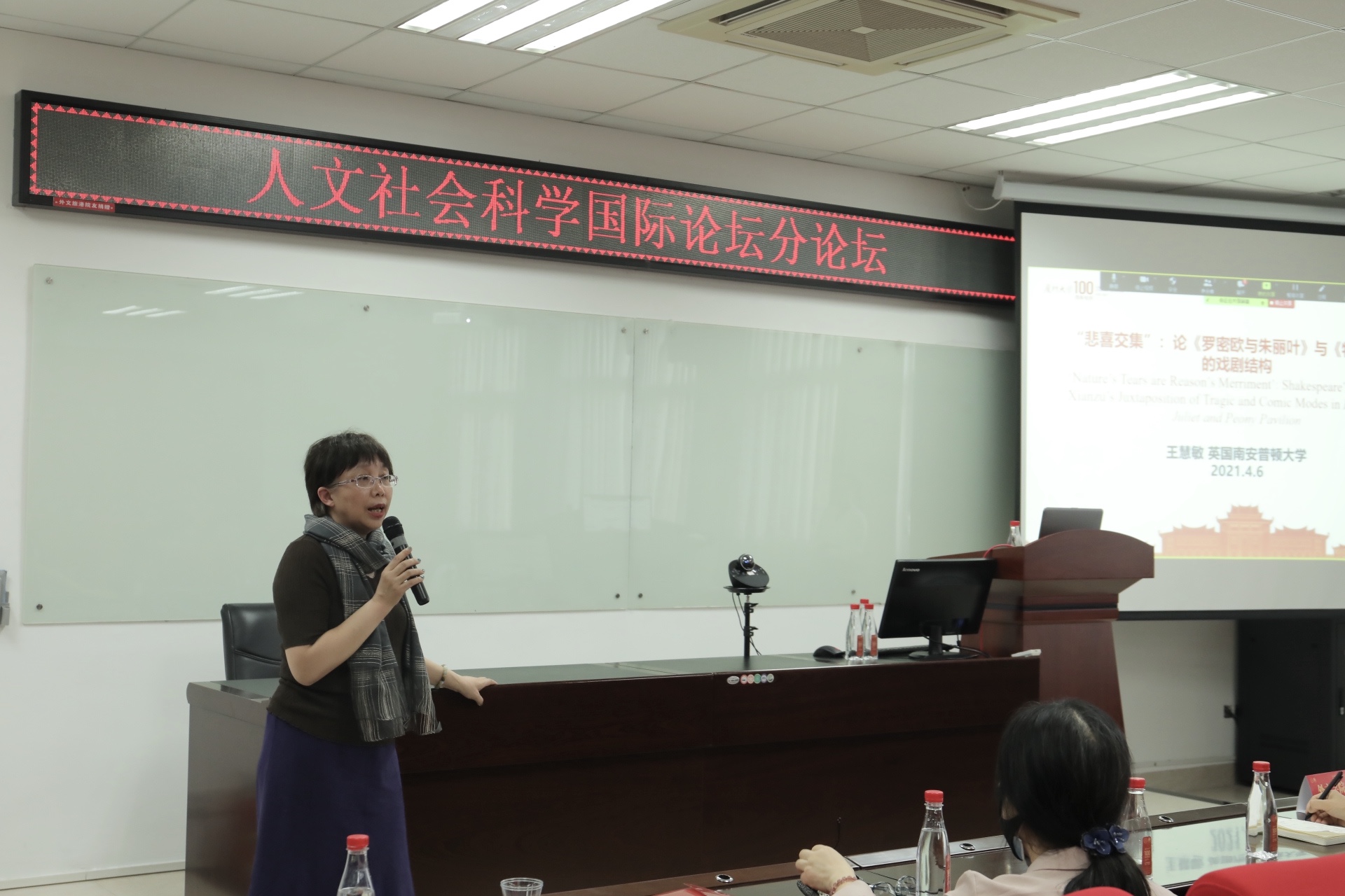 最后,英国南安普顿大学比较文学博士生王慧敏发表了题为“‘悲喜交集’:论《罗密欧与朱丽叶》与《牡丹亭》的戏剧结构”的演讲。她认为,两个文本中,女性的悲剧以及葬礼中讽刺性小人物出场安排的共同原因在于“悲喜交集”论。她提出朱丽叶和杜丽娘的悲剧都需要大众思考教育方式的问题,提议通过对比启发思考,并进一步指出针对当前现实问题的讨论将会是对这两部作品最好的改编。