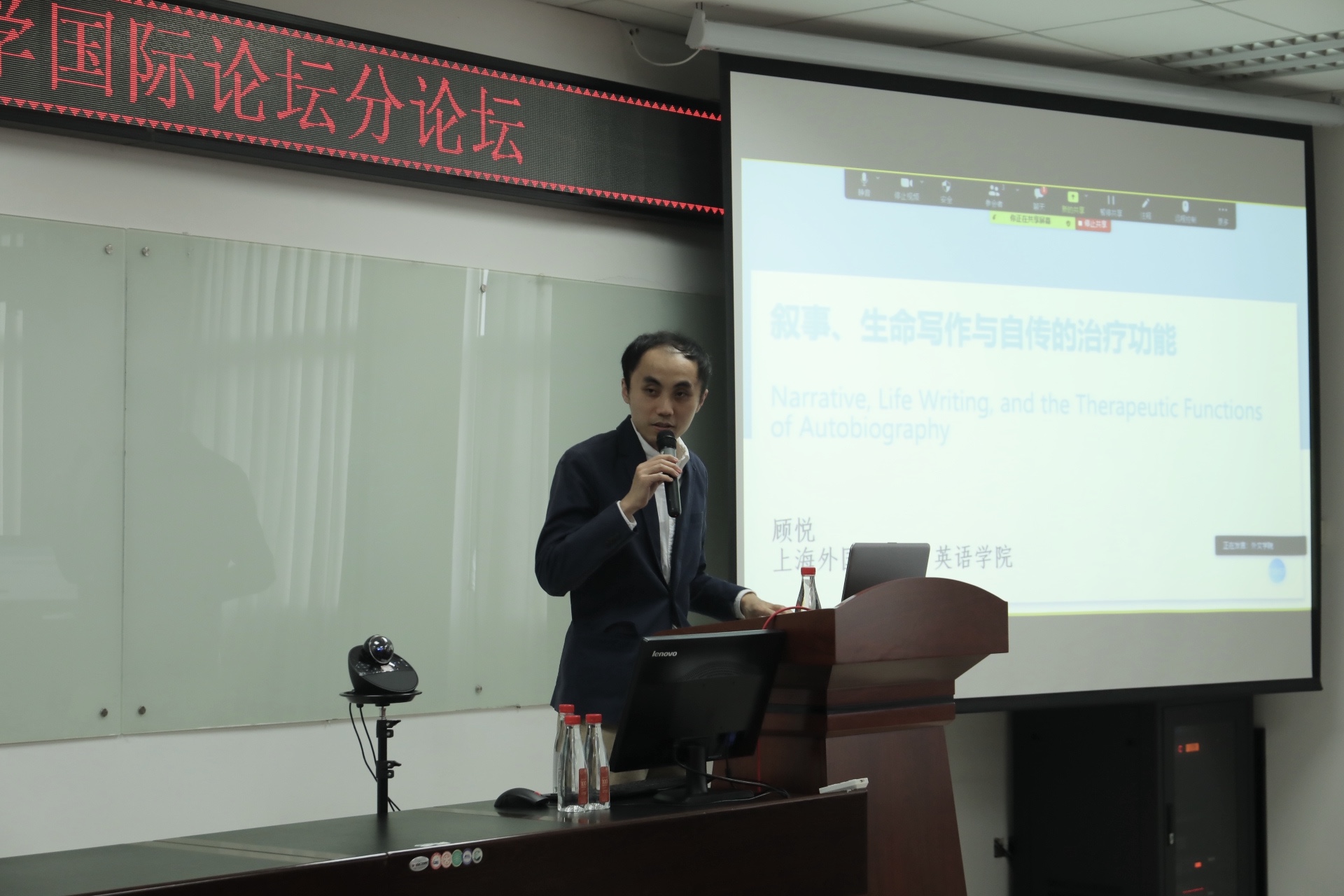 接下来,上海外国语大学英语学院顾悦教授带来了题为“叙事、生命写作与自传的治疗功能”的演讲。顾悦教授以心理学疗法叙事治疗作为切入点,分析了自八十年代起文学研究领域“生命写作”的浪潮与叙事疗法之间的关系,并以自身的课堂实践为例阐释他所发现的生命叙事中的双重自我。他认为来访者拥有疗愈的一切资源,书写本身也是疗愈的过程。