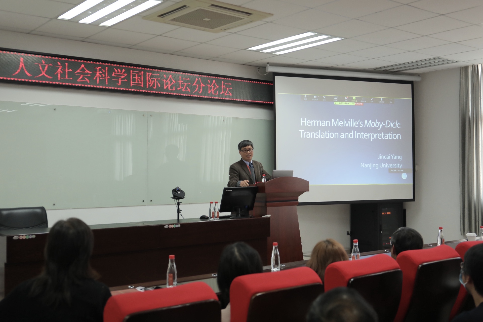 随后,南京大学外国文学研究所所长、《当代外国文学》主编杨金才教授发表了题为“赫尔曼·麦尔维尔的《白鲸》:翻译与阐释”的演讲。杨教授对比分析了曹庸、成时、张子宏的中译本,探究译者们如何使这部19世纪的美国小说适应当代中国的语境。杨教授还向观众提供了解读《白鲸》的全球化视角,认为其反映的独特趋势再现了英美和国内对麦尔维尔及其作品研究的对称性。杨金才教授的演讲结束后,在场的嘉宾踊跃提问,杨教授针对霍桑和梅尔维尔对种族和宗教的态度──特别是梅尔维尔对清教主义的消极态度──作出回应。