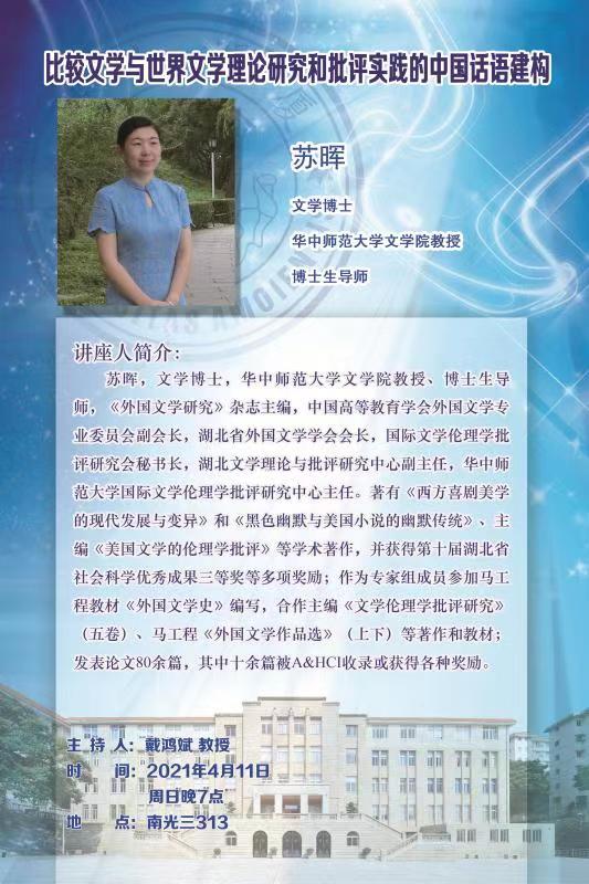 4月11日晚19:00,厦门大学外文学院特邀华中师范大学文学院教授、博士生导师、《外国文学研究》杂志主编苏晖教授为我们带来了题为“比较文学与世界文学理论研究和批评实践的中国话语建构”的讲座。讲座由厦门大学外文学院戴鸿斌教授主持,于厦门大学外文学院德贞楼313会议室举行。