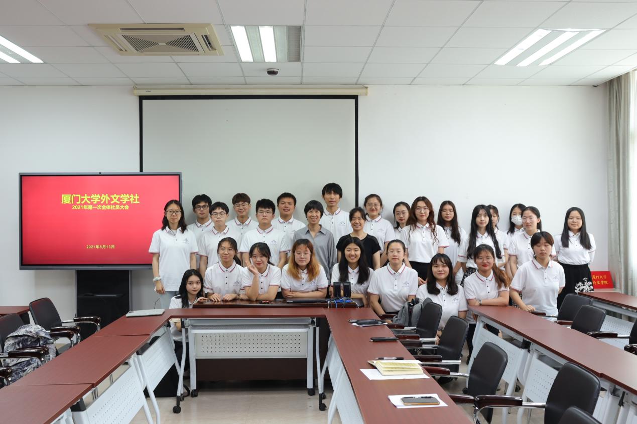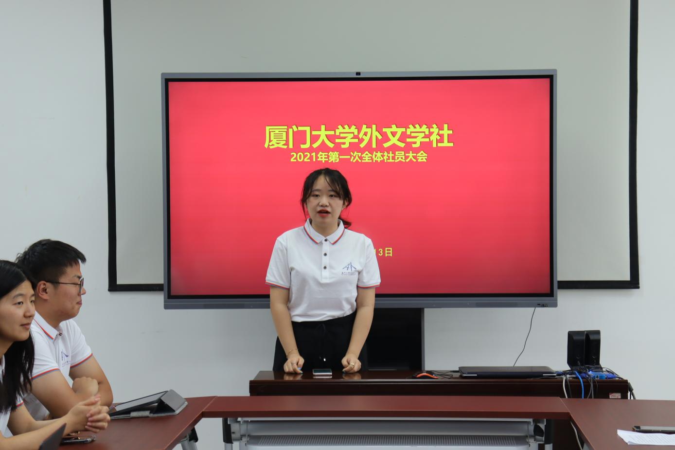 5月13日中午,厦门大学外文学社2021年第一次全体社员大会在德贞楼319报告厅顺利召开。会议介绍了外文学社及其下属各俱乐部2020年度发展情况,并提出本年度的工作安排和计划。外文学院党委副书记沈丽秀,团委副书记、外文学社指导老师戴晓燕出席了会议。会议由2018级法语专业本科生陈睿泽主持。