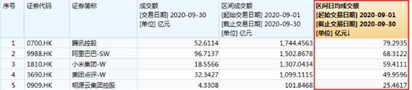 数据显示,9月30日港股成交额排名前十的除了友邦保险以外,其余全是中资股,日成交额排名前五的分别是阿里巴巴,成交额96.7亿港元;腾讯控股,成交额52.6亿港元;美团点评成交额32.34亿港元;平安好医生成交额25.66亿港元;比亚迪股份成交额21.3亿港元。自9月份以来日均成交额排名前五的全部是新经济企业。