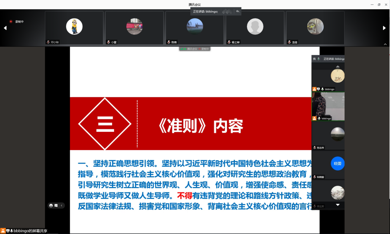 与会导师纷纷表示,通过此次学习,进一步明确了底线、高线、红线,接下来将在持续学习对照的基础上,认真规范自身指导行为,全面落实研究生导师立德树人职责。