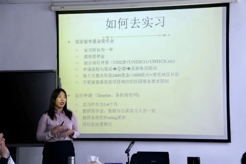 12月3日-5日,四场精彩纷呈的国际组织专家讲座先后开讲。阮红梅以“国际组织人才需求和高校全球治理后备人才培养”为题,介绍了中国新时代外交战略及国家、国际组织人才培养需求、人才培养理念与教学体系的探索等内容。她“模拟联合国”的概念、运作模式和发展现状进行了详细讲解。国懿则以“中国与联合国”为题,回溯了联合国诞生过程,着重分析了近现代中国的外交史以及中国与联合国关系的发展史。他指出,当今中国的发展机遇和挑战并存,呼吁青年一代要积极关注联合国与国际组织动态,积极拓宽视野能力、充实职业规划,努力为维护世界和平与秩序稳定做出贡献。王纪元以“Work For The UN”为题,从联合国发展系统的构成及运作机制、可持续发展议程、国际公务员体系等方面进行了解读,并介绍了相应的机构及其笔试面试的实用建议,使得广大师生对联合国的工作有了更充分的了解和认识。刘志贤作了“联合国与多边外交”的专题讲座,他从联合国的成立原因、服务宗旨与目标、在国际事务中发挥的各项作用等方面细致全面阐述了联合国的基本情况,并强调了成为多语种沟通协作的“一精多会”和“一专多能”高素质国际化复合型专门人才的重要性,勉励同学们将自我发展与国家命运紧密联系,为中国的发展贡献力量。