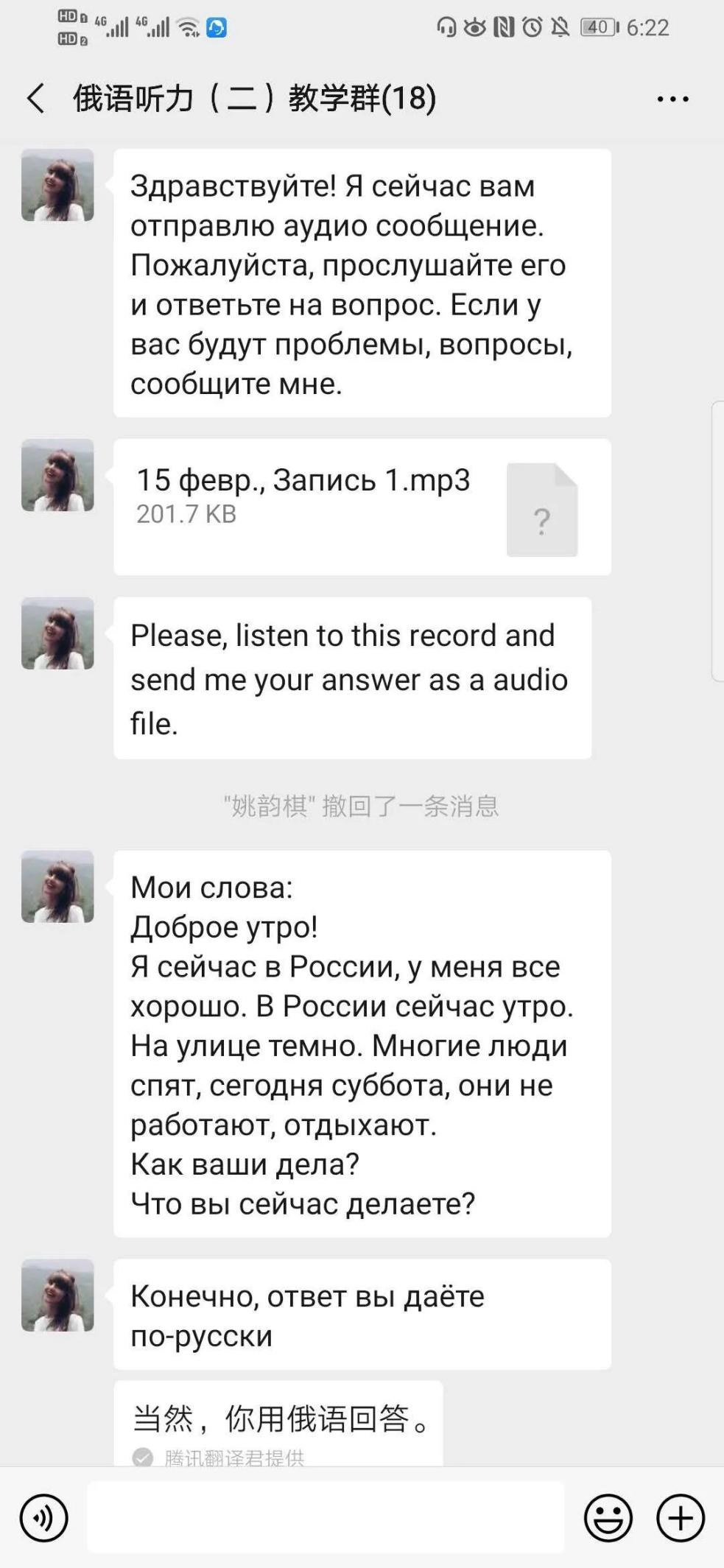 俄语外教Olga目前为止教学进展顺利,之前有过一些线上教学的经验,相对不算太陌生。我会提前备好上课材料,发给学生。同时,非常感谢我的系部,他们给了我很多支持。