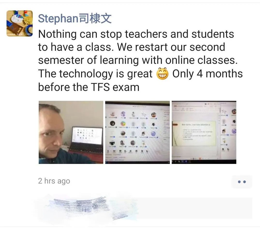 Stephan老师课后还发了朋友圈:没有什么可以阻止老师和学生上课。我们开始了第二学期的在线课程。技术是伟大的。距离TFS考试只有4个月啦。