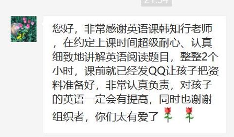 这次活动中,和我对接的学生和家长让我觉得非常感动。虽然平时课业繁忙,学生还是认真完成了布置的作业,听讲也非常认真;而家长在我上完辅导课还发来了长长的感谢,我深觉受之有愧。和前线的医护人员相比,我们做的贡献真的非常有限;可就是这样有限的帮助,却也得到了如此多的感谢和爱。这让我更加有动力,将这份爱继续传递。