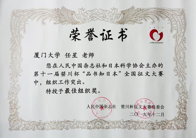 2019年11月18日,由人民中国杂志社、日本科学协会和上海交通大学共同举办的“2019笹川杯——品书知日本全国征文大赛”评审结果揭晓,外文学院师生荣膺该赛事三项大奖。华体网2018级日语专业本科生黄凯琪同学荣获冠军(优胜奖),外籍教师皆见浩史老师荣获“优秀指导教师奖”,任星老师和王海老师荣获“最佳组织奖”。这是继2018年荣膺该赛事三项大奖之后又一次的突出表现。充分展现了华体网学子良好风貌和扎实的语言功底。