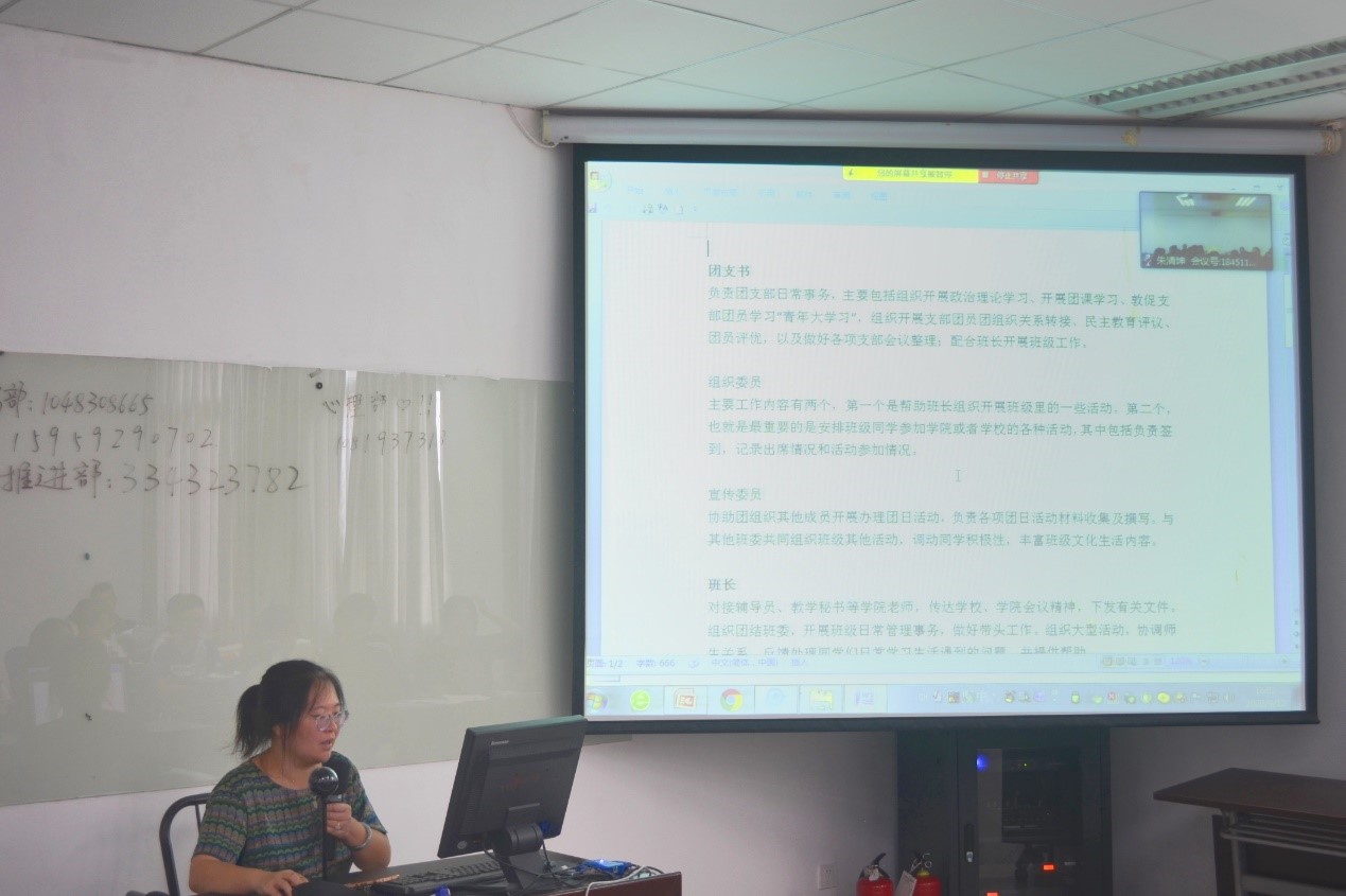 9月12日下午,外文学院团委书记、研究生辅导员吴珊珊就同学们关注的毕业与就业、户口迁移、医保以及生活中可能遇到的安全隐患、诈骗信息、心理问题等方面,结合具体情况和实际案例进行了详细的讲解。吴珊珊老师引导同学们重视自主管理,充分了解学校、学院、学生组织的职能,鼓励同学在享受他人服务和帮助的同时也参与其中。在讲座中,吴珊珊老师介绍了研究生班团组织的基本架构及职责义务,鼓励同学们积极参与班团建设,锻炼个人综合能力。接着,2020级研究生新生举行了班级、团支部委员的竞选并顺利产生委员名单。此外,吴珊珊老师还特别强调了疫情期间学校的管理制度,叮嘱同学们做好每日健康打卡,外出须向学院报备,人流密集时佩戴口罩。