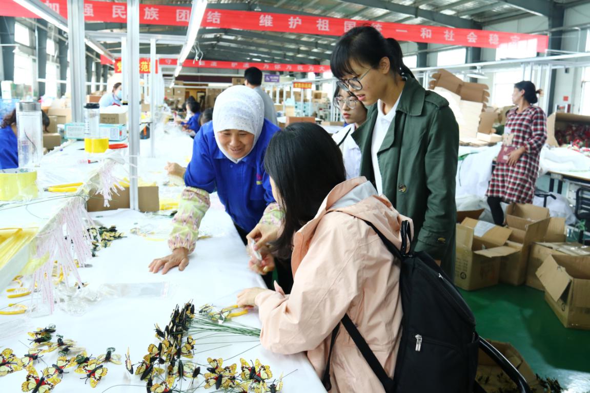 随后,实践队继续前往宁夏隆德人造花工艺有限公司体验学习。宁夏隆德人造花工艺有限公司2013年通过招商引资来到隆德,目前已是闽宁协作企业的示范窗口和西北最大的残疾人就业基地。在潘胜贤经理的带领下,队员们领略了千余种样式美观、栩栩如生的人造花样品,并亲眼见证了人造花在工人们的巧手中从零件绽放为“鲜花”。慨叹之余,实践队员们也纷纷向企业职工请教了人造花制作方法,并与工人们一同劳动。组装花束、粘贴标签、投送分类,队员们热情高涨,工作高质高效,得到了工厂职工的一致好评。在流水线作业中,队员们深刻认识到团结协作的重要性,也更加坚定地体会到“劳动创造美好生活,劳动不分贵贱”。广大劳动者在平凡的岗位中展现自身价值,为脱贫攻坚贡献着自己的一份力量。