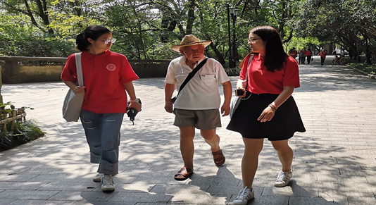 下午3时,实践队来到台州市九峰公园,走访陈老师初中时就读的黄岩中学九峰书院分部旧址。一同前往的还有陈老师的中学同学卢奇燕、徐世臣两位老师,他们虽已年近九旬,却仍精神矍铄,将中学时代的故事向实践队员们娓娓道来。两位老人激动地回忆起,台州解放时,同学们自发在城门口迎接解放军入城时的情景,声情并茂的讲述仿佛将实践队员们带回了那样一个激动人心的时刻。卢奇燕老师还与实践队员分享了她的丈夫在抗美援朝时期响应国家号召,毅然选择学医从军的往事,他们的赤子之心与爱国之情深深地打动着实践队员们,也使队员们更加坚定了发愤图强、报效祖国的决心。在一同了解了书院巨变,重温了奋斗往事后,卢奇燕老师对于数十年间时代的变迁与祖国的发展感慨万千,感慨之余,她还不忘勉励实践队员们珍惜当下优越的读书条件,志存高远,脚踏实地,既要潜心治学,也要积极为国家和社会做出奉献。老师们的殷殷期盼使队员们如沐春风。