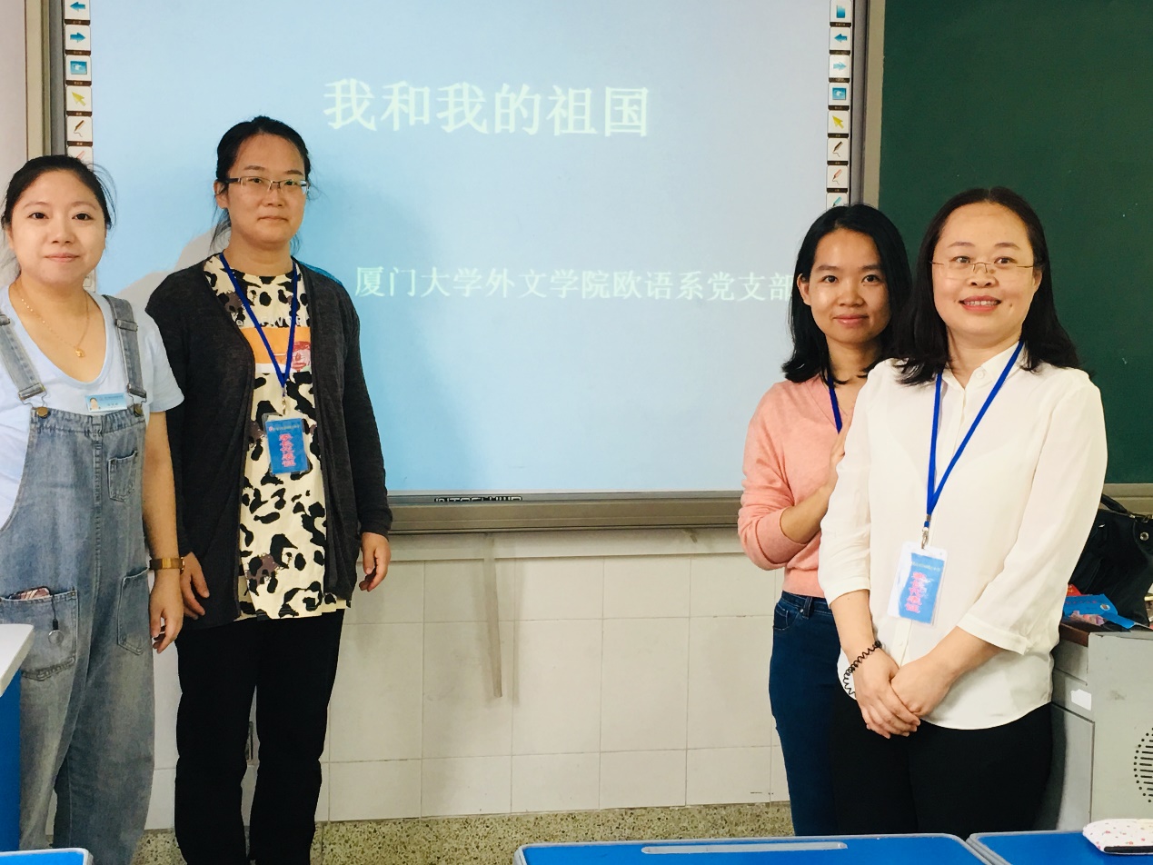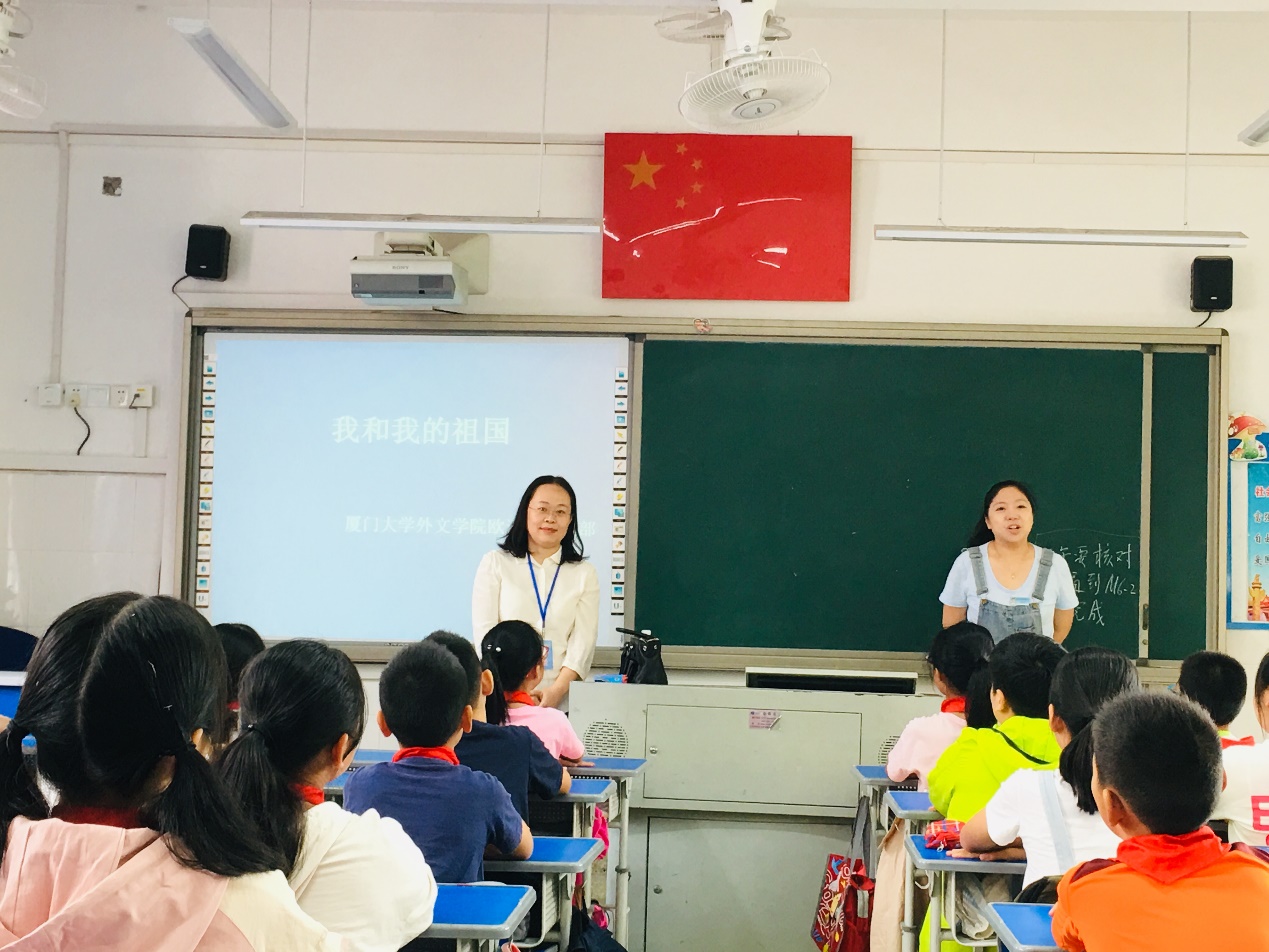 2019年10月24日上午,受前埔南区小学邀请,欧语系教工党支部副书记于丹红同志、支部党员王文毓、谢敏同志,走进小学课堂,上了一堂生动的爱国主义思政课。