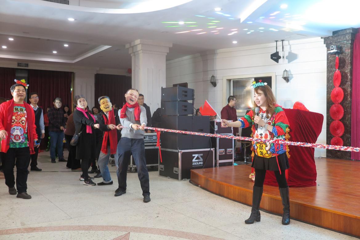 一段热闹的抖肩走秀舞拉开了晚会的帷幕。歌伴舞《在水一方》表现了外文女教师温婉大方的气质;外文学院退休教师带来的独唱(钢琴伴奏)《我爱你,中国》及合唱《华体网祖国》表达了外文人对祖国母亲深厚浓郁的爱意;外教歌曲串烧和欧洲宫廷舞充分体现了外文学院的国际元素,以及外文学院兼容并蓄、海纳百川的胸襟和气魄;歌伴舞《军港之夜》唤起了大家内心澎湃的军旅之情;《小人物喜剧舞》和教职工子女表演的儿童节目《新版拔萝卜》展示了外文人的青春活力和新一代外文接班人的蓬勃朝气;富有创意的《师徒大拜年》节目展现了老师们对外文学院和伟大祖国美好未来的殷切希望和衷心祝福。联欢会的另一抹浓色则是异彩纷呈的互动游戏,比如令人捧腹的《面具拔河》、扣人心弦的《你划我猜》和充满运动元素的《踩气球》等,这些生动活泼的互动游戏为联欢会增添了无限生机和热烈气氛。