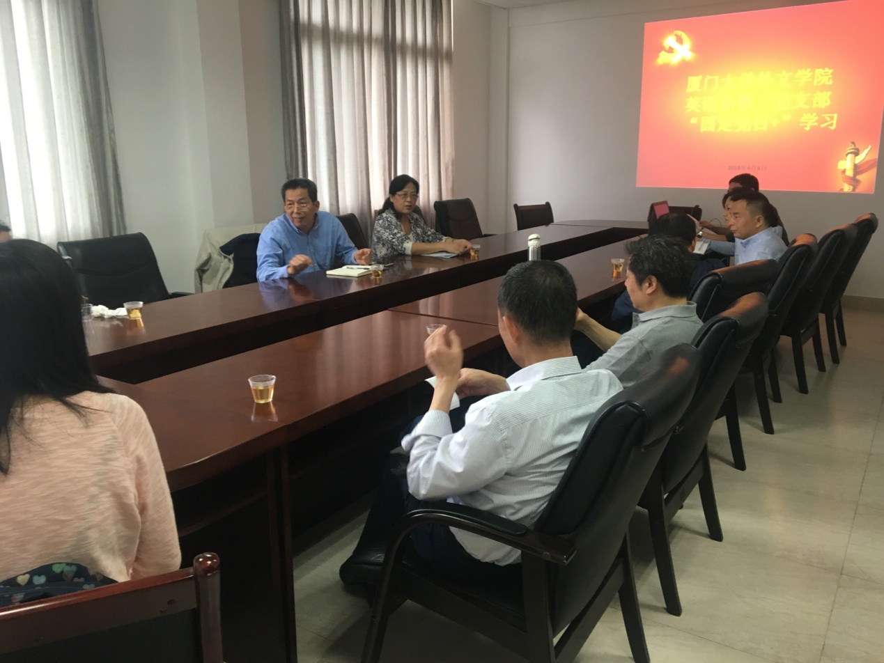 2019年4月8日下午,外文学院英语系教工党支部于南光三524教室开展了“固定党日+”活动,学校党委巡查组副组长黄定基、学院党委书记陈志伟出席本次活动,10位支部党员到场。