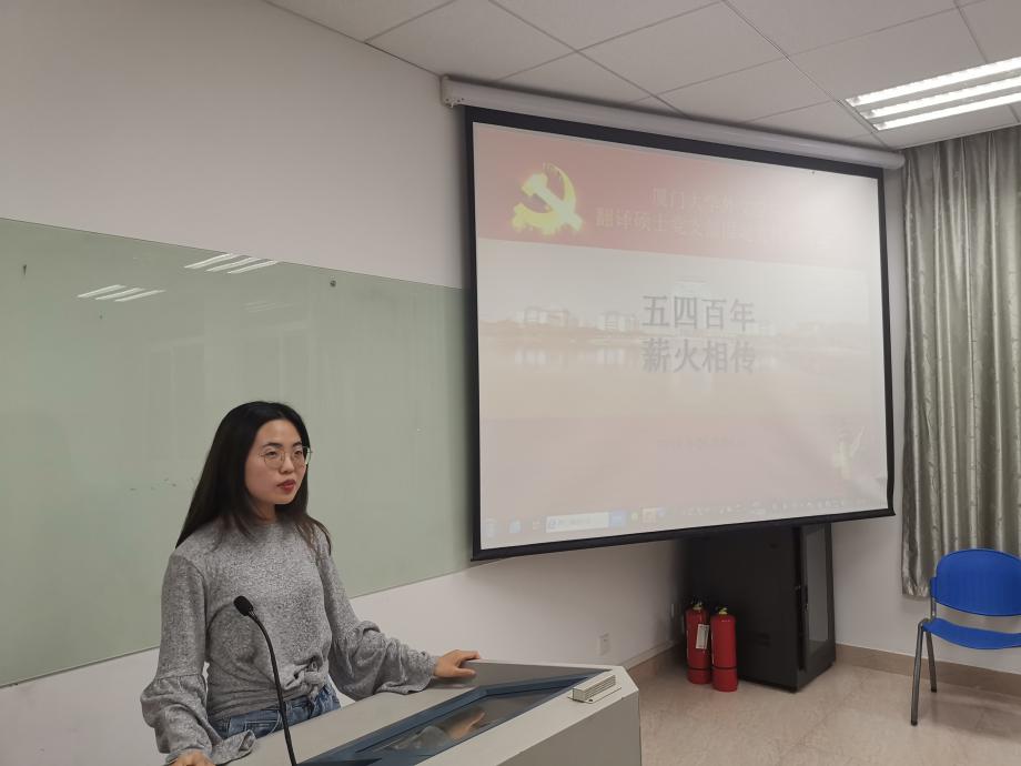 活动的最后,同学们支部党员们一起观看了厦门大学拍摄的五四百年传承篇的视频。,贡淑林同学表示,一百年前国家危难之际,青年学生们的勇气与志向让人敬佩,作为新时代青年,我们更需要继承他们的勇气与品质,拥有远大志向,与志向,做社会主义的建设者和接班人。康婷亭同学则表达了自己作为一个厦大人、一个中国人的自豪,希望能够秉承嘉庚精神,砥砺前行,再创辉煌。