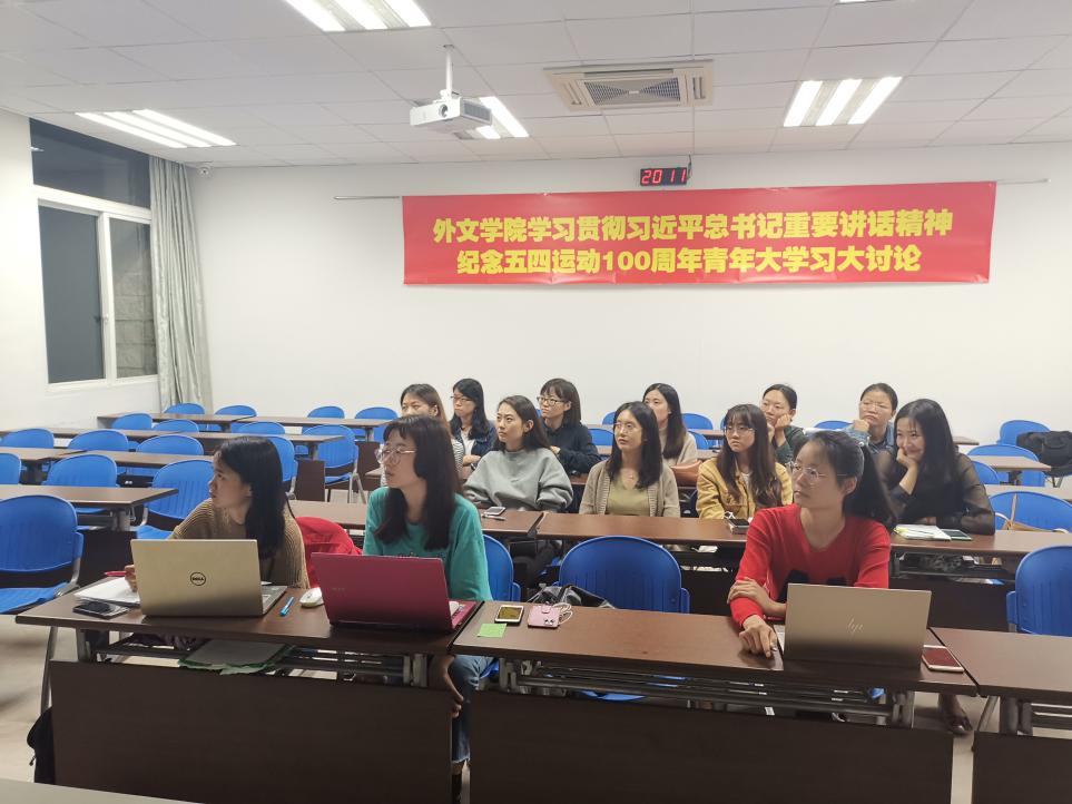为纪念五四运动一百周年,5月6日晚,为纪念五四运动一百周年,外文学院翻译硕士党支部以“五四百年,薪火相传”为主题开展5月的“固定当党日+”活动,组织支部党员学习习近平总书记在纪念五四运动100周年大会上的讲话精神,重温五四历史,体会五四精神。