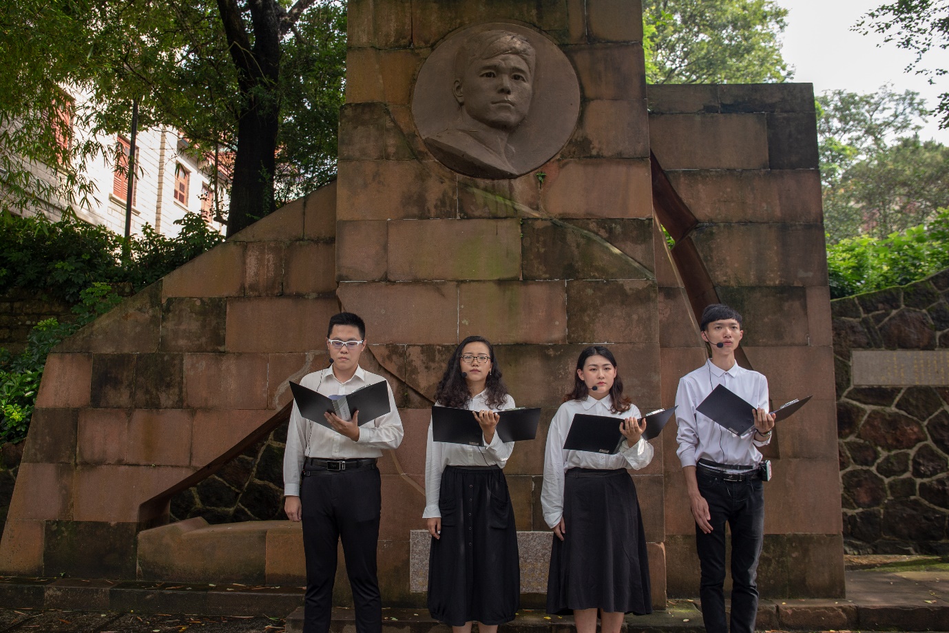 参观完革命史展览馆后,党员们步行至罗扬才烈士雕像前学习罗扬才烈士先进事迹。作为新党员代表,2016级英语专业本科生倪天宇、2016级日语专业本科生罗舒文、2017级俄语专业本科生陈沖杰和2017级西班牙语专业本科生景琛倩四位同学共同朗诵了《致罗扬才烈士》,以此表达对革命先烈勇于担当的英雄气概和不怕牺牲的大无畏精神的崇高敬意。通过学习罗扬才烈士的革命事迹,党员们更加明确了自身肩负的使命与责任——心系家国,在奋斗中奉献青春力量。