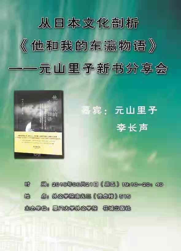 2019年06月21日(周五)19:10-21:00,外文学院举办了以《当代〈菊与刀〉:日本文化解码》的学术讲座,为外文学院院友、日籍中日双语作家元山里子女士举行了新书《他和我的东瀛物语》分享会。本次活动由厦门大学外文学院与花城出版社共同举办,花城出版社揭莉琳编辑主持了本次讲座。