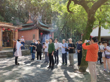 经过两个多小时的车程,退休老师们来到了第一站安溪清水岩。一下车,大家就被这里清新的空气、开阔的视野、优美的景色所吸引。老师们一路边走边聊,游兴浓郁,相互热情交流,展现出一派其乐融融的氛围。特别是当大家走到一颗参天巨大的香樟树前,导游介绍此树因为感动清水祖师的思乡之情而枝枝朝北,立刻感染了大家重阳登高思乡的情怀。林娟娟老师说:“这里风景美如画,奇峰突兀、楼阁崔嵬、石泉清冽、风光旖旎,毫不辜负蓬莱仙境之美誉。”