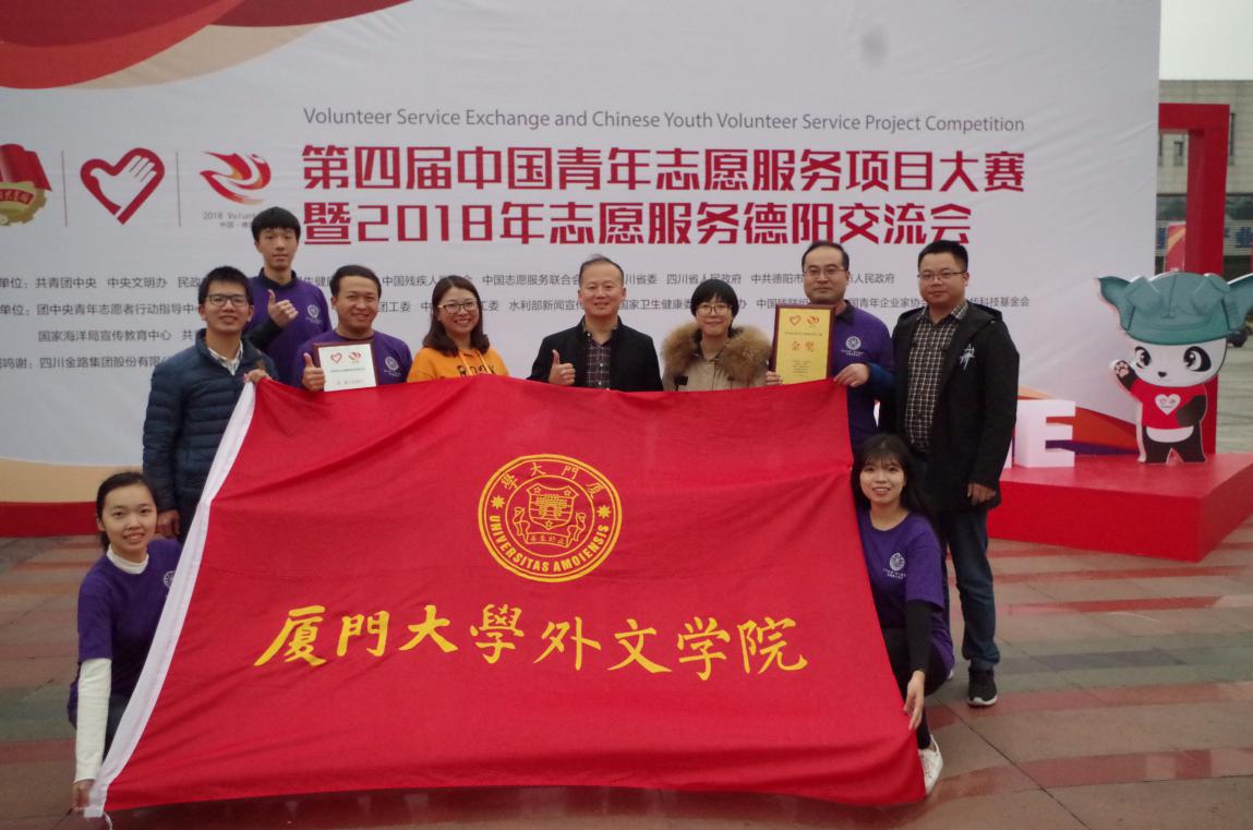 在第33个“国际志愿者日”来临之际,12月1日至3日,第四届中国青年志愿服务项目大赛暨2018年志愿服务交流会(以下简称“志交会”)在四川省德阳市举行。由外文学院指导推荐参赛的“紫奇频道”——厦门大学盲人电台志愿服务项目获大赛金奖,“E晚情深”老年大学英语教学行动项目获大赛铜奖。此外,“手望”手语志愿翻译服务项目成功入选全国青年志愿服务示范项目库,成为厦门大学首个入库项目,入库项目全国仅100个。