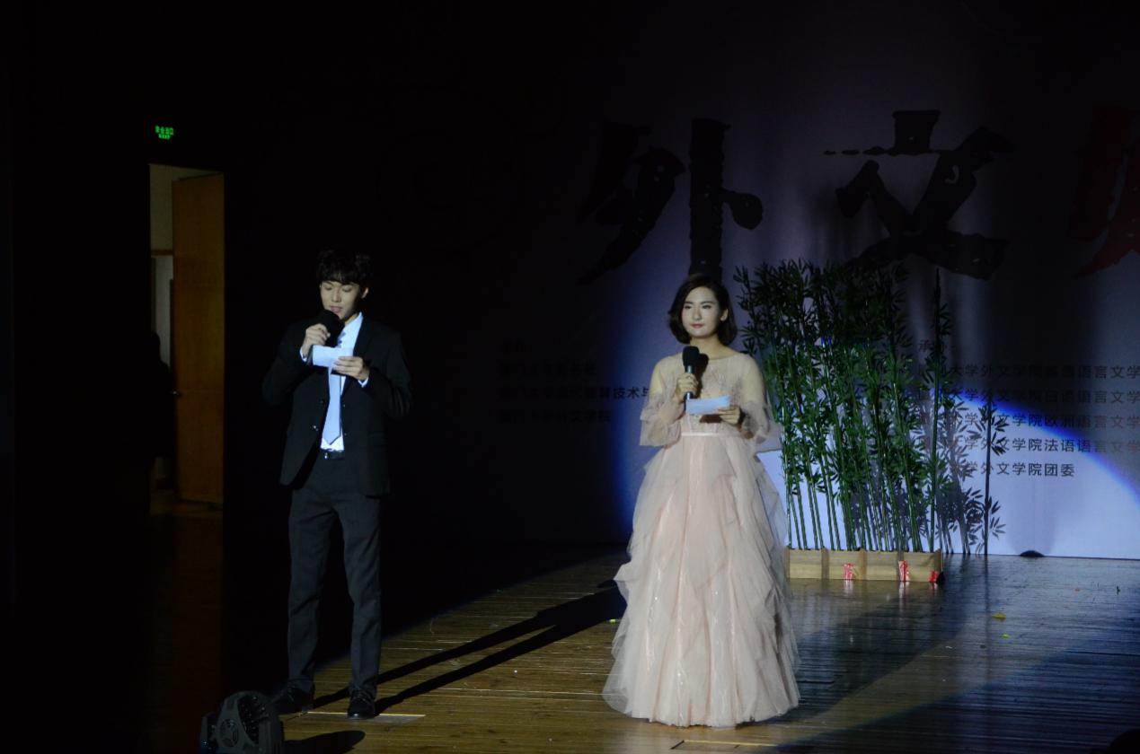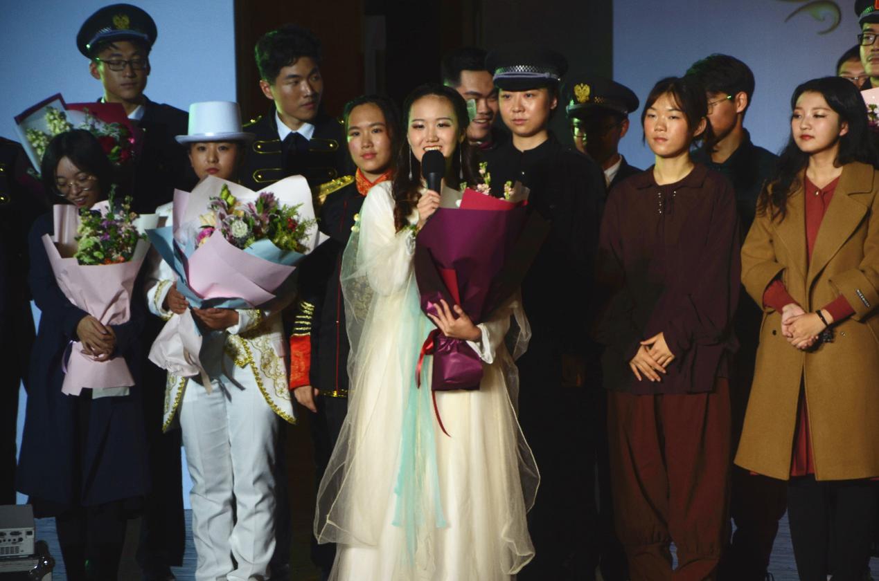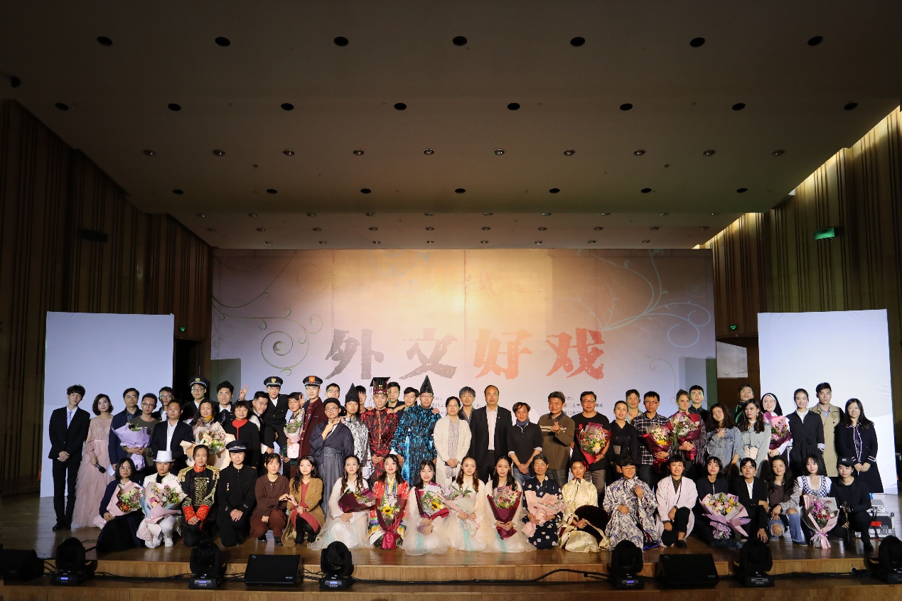 节目表演结束后,剧组人员上台谢幕,同学们为辛勤付出的指导老师们和剧组同学们献上鲜花。去年以演员身份参与“外文好戏”,而今年担任日语剧目学生导演的黄丽蓉同学坦言:“两次不同的体验让我更加坚信——一部好的戏剧演出离不开所有人的努力。”俄语剧目学生导演周寰同学去年也曾参与演出,他表示:“每一届“外文好戏”的水准都在不断提升。”德语剧目的导演、外籍教师Janina Becker表达了对到场观众的感谢和对全体剧组同学的认可,赞扬了同学们扎实的言语功底及精湛娴熟的表演。