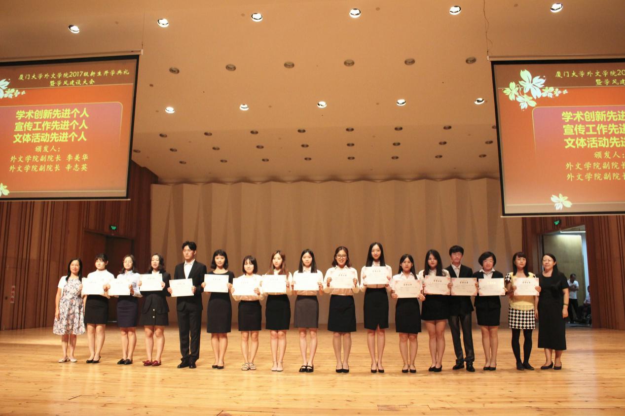 为树立优良学风,喜迎党的十九大,10月14日下午3时,厦门大学外文学院2017级新生开学典礼暨“喜迎十九大”学风建设大会于科学艺术中心音乐厅成功举行。77级英语专业代表、外文学院原党委书记苏子惺,77级英语专业代表、厦门大学人口研究所副教授郑启五,77级英语专业代表、厦门航空有限公司副主任林莹如,福建省自强助残基金会创始人、闽南师范大学外国语学院教授郑声滔,85级英语专业代表李梅,学院党委书记陈志伟,院长张龙海,党委副书记郑新风,副院长李美华、辛志英和各系部领导老师出席开学典礼。本次典礼由外文学院党委副书记郑新风主持。