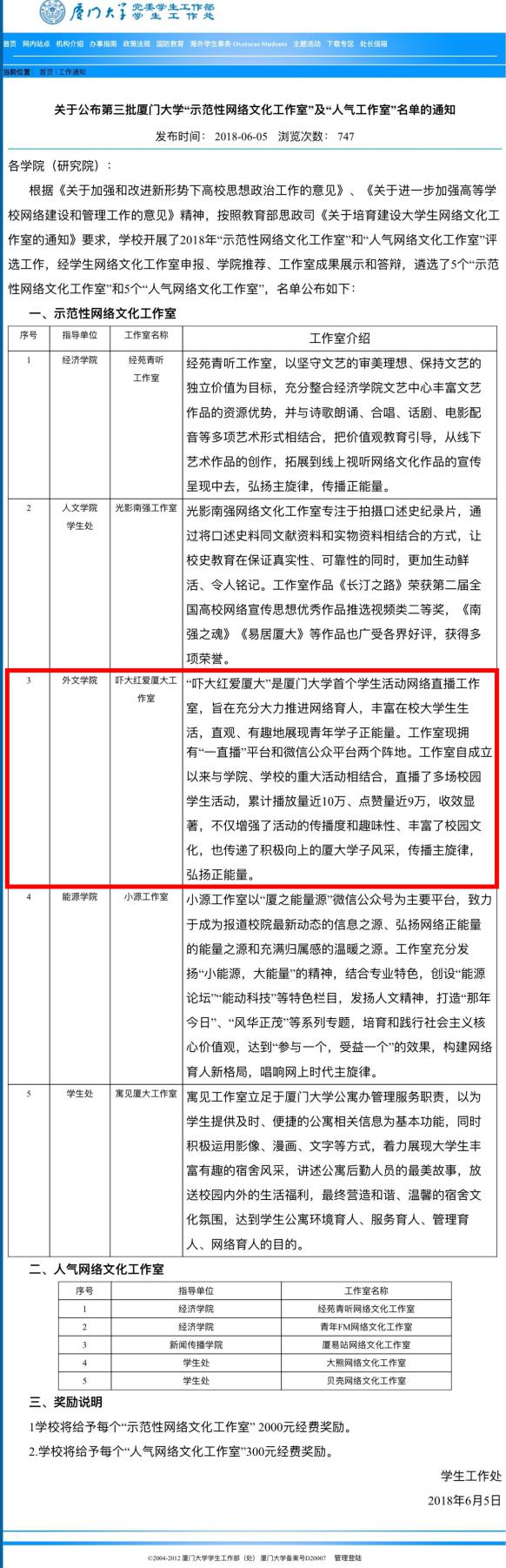 6月1日下午,厦门大学第三批“示范性网络文化工作室”评选在自钦楼多功能厅举行。外文学院“吓大红爱厦大”网络文化工作室(以下简称“吓大红爱厦大”)经自主申报、学院推荐、成果展示和答辩等环节考核,获评厦门大学第三批“示范性网络文化工作室”(全校仅5个)。