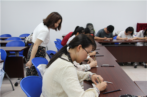 在李颖老师的指导下,同学们拿起画笔,铺好纸砖,先在纸砖的四个角落画点,再加上边框,暗线,描出图样,填充阴影,现场非常安静,李颖老师不断地轻声提醒同学们:“放轻松,吸气,呼气,什么都不要思考,沉下心来”。同学们也慢慢进入了状态,现场只听到铅笔沙沙的声音。