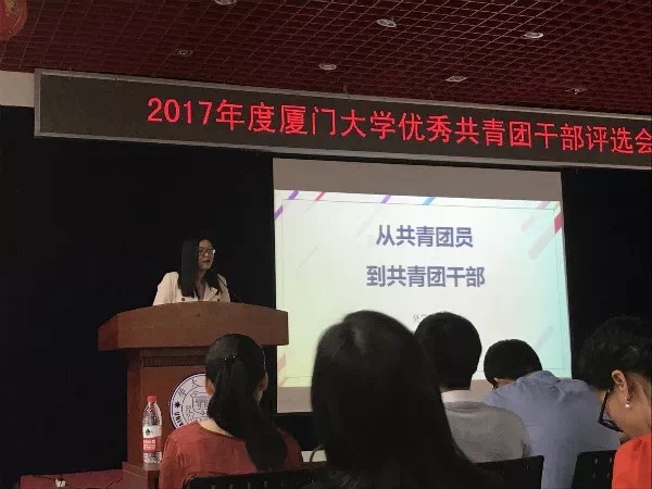2017年度“厦门大学优秀共青团干部”评选活动于411日举行。外文学院辅导员杨盛澜老师在个人展示中以“从共青团员到共青团干部”为题,从思想引领、素质拓展、组织提升等团的重点工作方面分享了自己的个人感悟。在思想引领上,她高度重视团组织的基础建设,同时旗帜鲜明地开展主题教育活动,使思想政治教育入脑入心入行。同时,她不断丰富团学活动形式,以学术竞赛、校园文化活动、志愿服务、社会实践等形式拓展团员综合素质。入职以来,她还始终以学生组织为抓手,注重提升团组织的凝聚力,潜心培育团员成长,培育了一批优秀的学生团员骨干和群体。她表示,长期以来的共青团工作实践让她从一名团员青年成长为一名真正的共青团干部,更给她未来的工作指明了方向。最终,杨盛澜老师成功获评“优秀共青团干部”称号。