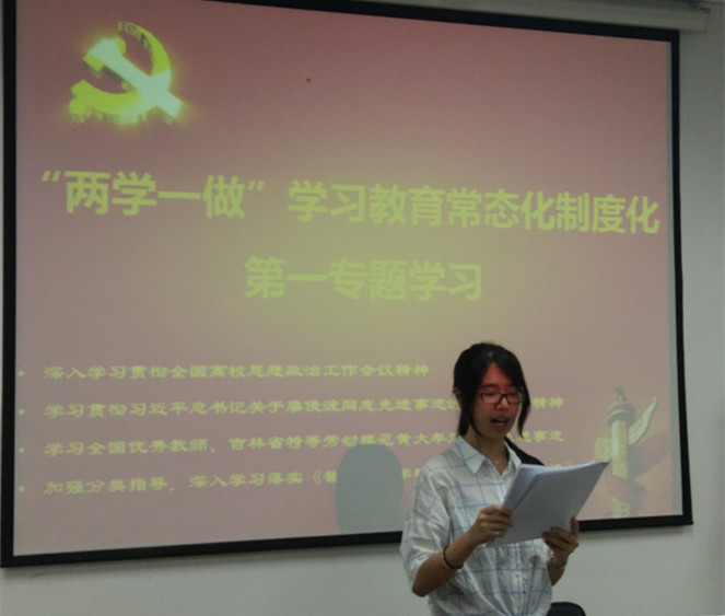 5月26日晚8点,外文学院2013级本科英专3、4班党支部在南光三319会议室进行了“两学一做”学习教育常态化制度化第一专题的学习活动。首先,由支部书记肖宁双同志介绍本次专题学习的主题:深入学习贯彻全国高校思想政治工作会议精神;学习贯彻习近平总书记关于廖俊波同志先进事迹的重要指示精神;学习全国优秀教师、吉林省特等劳动模范黄大年同志的先进事迹;加强分类指导,组织学生党支部深入学习落实《普通高等学校学生党建工作标准》。