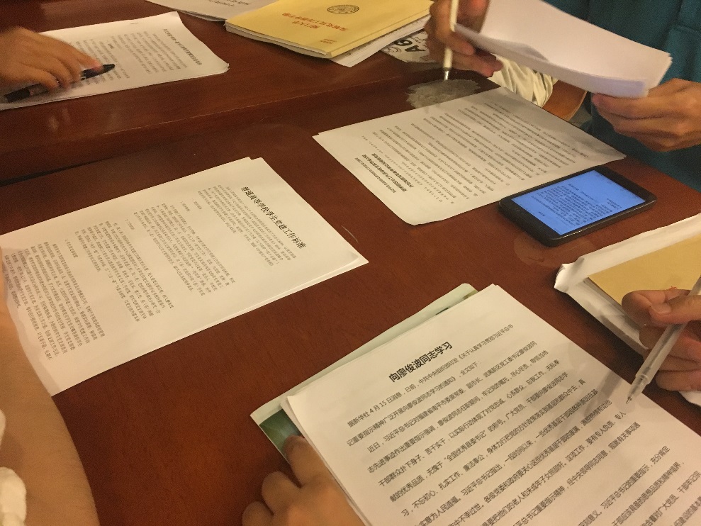 早在会前几天,党支部书记就安排好这次会议的流程了。因内容较多,再加上创新会议形式的想法,党支书给每一位与会党员都安排了“讲课”的任务,即每人根据学习要求各领一份文件会前学习研究,会上结合党支部的实际给其他党员讲述自己的学习心得,会后撰写学习体会。